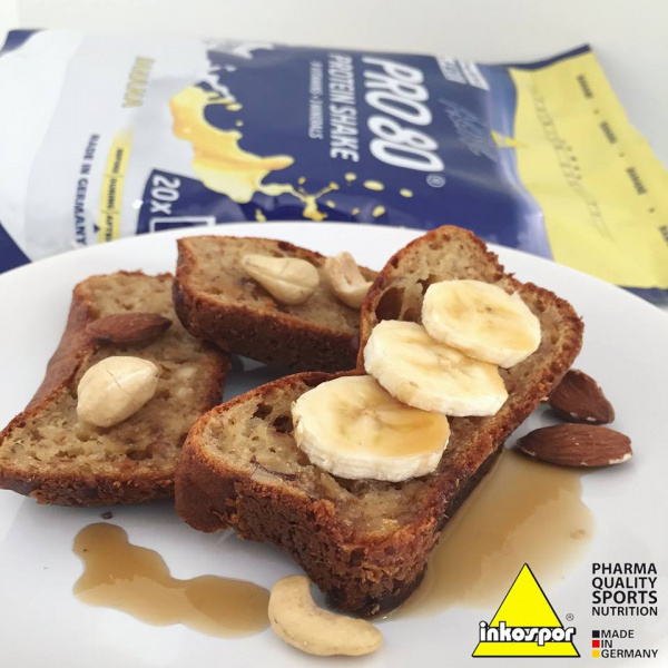 Těsto: 2 střední banány, 40 g proteinu PRO 80 příchuť banán, 2 vejce, 90 g másla, 180 g hladké mouky, 1 vanilkový cukr, 1/2 kypřícího prášku, špetka soli, hrst nasekaných ořechů, 200 ml mléka. (Varianta bez lepku : 180 g mouky Jizerka, 3 vejce, celý kypřící prášek.)